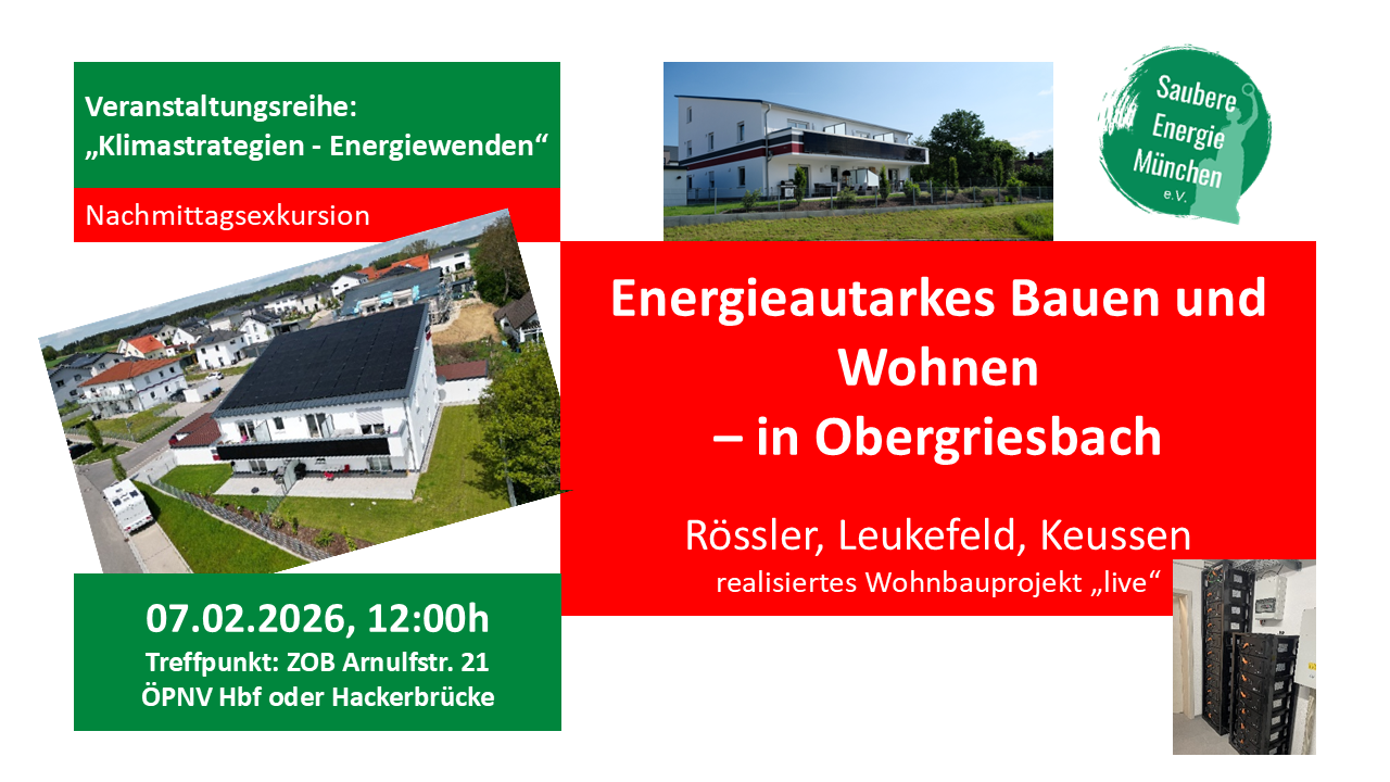 12:00h: Treffpunkt; ZOB Zentraler Busbahnhof, Arnulfstr. 21 12:30h – 13:30h: Busfahrt nach Obergriesbach 13:30h: Präsentation „Energieautarkes Wohnen“ 14:30h: Führung durch die Anlage und Besichtigung von Gebäude, Photovoltaik, Infrarotheizungen und einer Wohnung 15:30h – 16:30h: Rückfahrt |