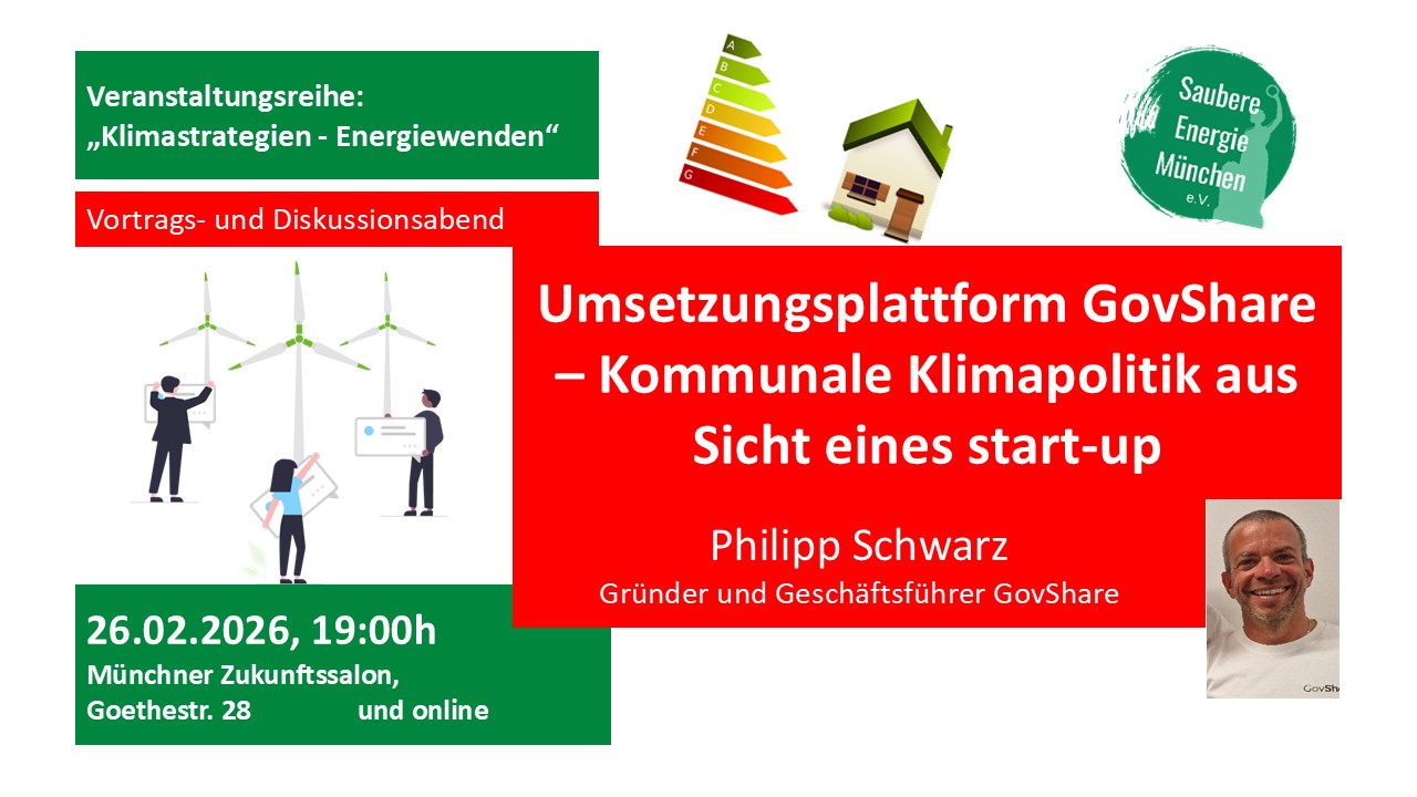 Münchner Zukunftssalon Goethestrasse 28, MünchenHybrid VeranstaltungWir laden ein zur nächsten hybriden Vortragsveranstaltung mit Publikums- und chat-Diskussion im Schwerpunkt "Klimastrategien - Energiewenden": Philipp Schwarz GovShare, Gründer und Geschäftsführer Umsetzungsplattform GovShare: Kommunale Klimapolitik aus Sicht eines start-up Donnerstag, 26.02.2026, 19:00h Münchner Zukunftssalon, Goethestr. 28, München auch per Zoom-Online und live auf YouTube Nicht nur Theorie, mal was „Praktisches“: Der Gründer der „Umsetzungsplattform“ […]
