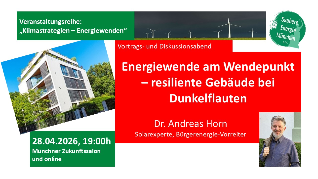 Münchner Zukunftssalon Goethestrasse 28, MünchenHybrid VeranstaltungWir laden ein zur nächsten hybriden Vortragsveranstaltung mit Publikums- und chat-Diskussion im Schwerpunkt "Klimastrategien - Energiewenden": Dr. Andreas Horn Solarexperte und Bürgerenergie-Vorreiter Energiewende am Wendepunkt – resiliente Gebäude für Dunkelflauten […]