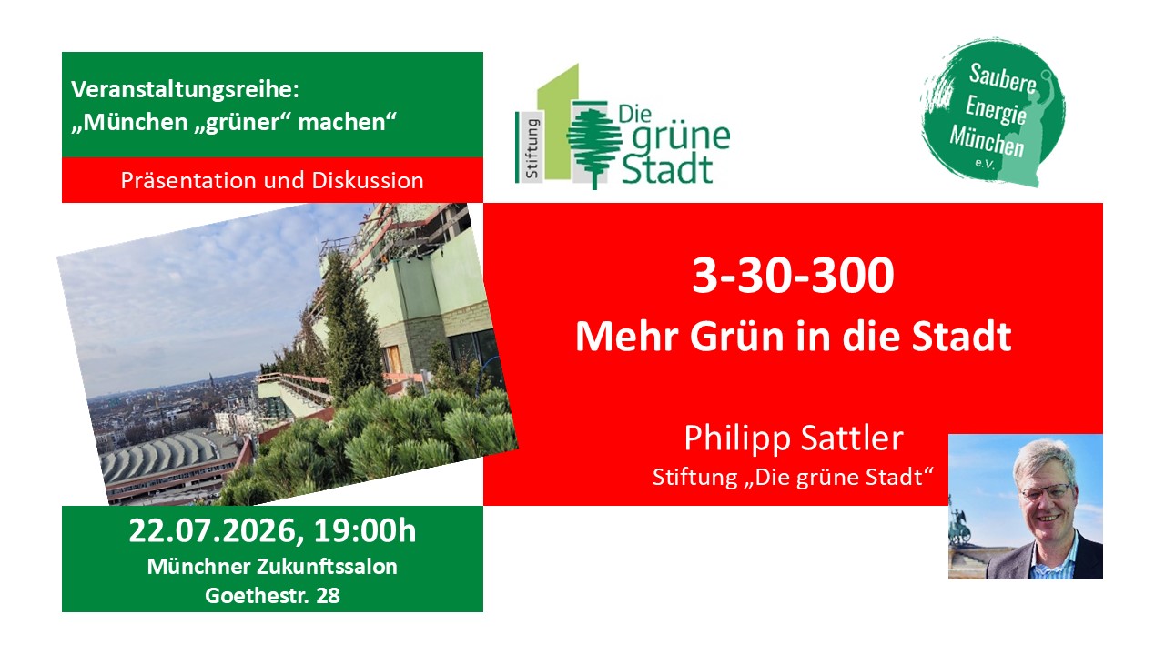 Münchner Zukunftssalon Goethestrasse 28, MünchenHybrid VeranstaltungWir laden ein zur nächsten hybriden Vortragsveranstaltung mit Publikums- und chat-Diskussion im Schwerpunkt "Mein Klima: München "grüner" machen": Philipp Sattler Stiftung „Die grüne Stadt“, Geschäftsführer 3-30-300 Mehr Grün in die Stadt Mittwoch, 22.07.2026, 19:00h Münchner Zukunftssalon, Goethestr. 28, München auch per Zoom-Online und live auf YouTube Unsere Städte leiden derzeit unter einer Polykrise: Klima, Biodiversität, […]