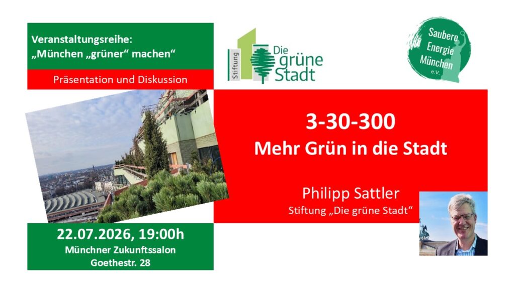 Wir laden ein zum hybriden Mulitivisionsvortrag mit Publikums- und chat-Diskussion im Schwerpunkt „Mein Klima: München „grüner“ machen“: Christopher Meyer Landschaftsökologe, Naturfotograf, Autor und Vortragender Niklas Banowski Biologe, Umweltplaner, Fotograf, Arten- […]